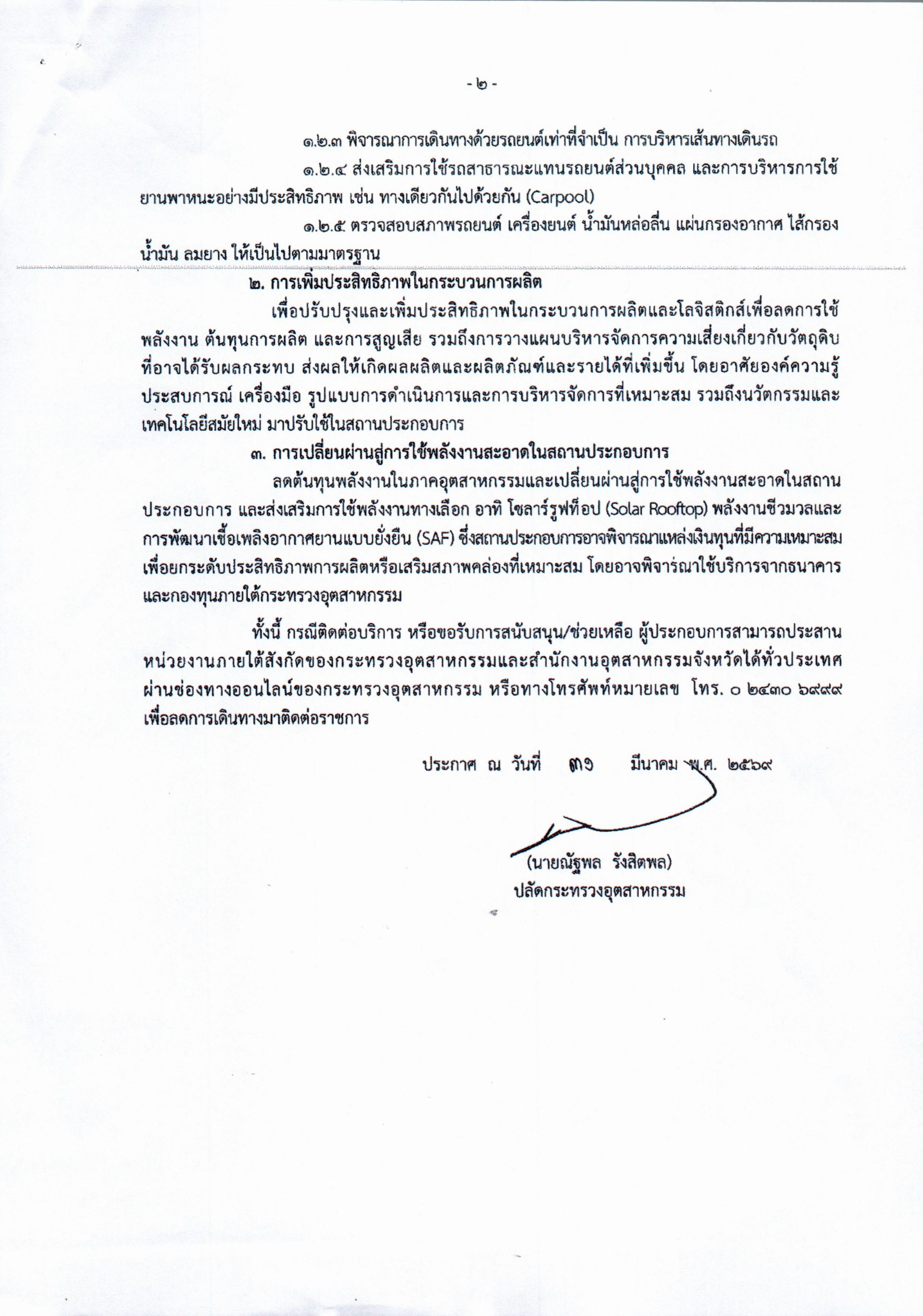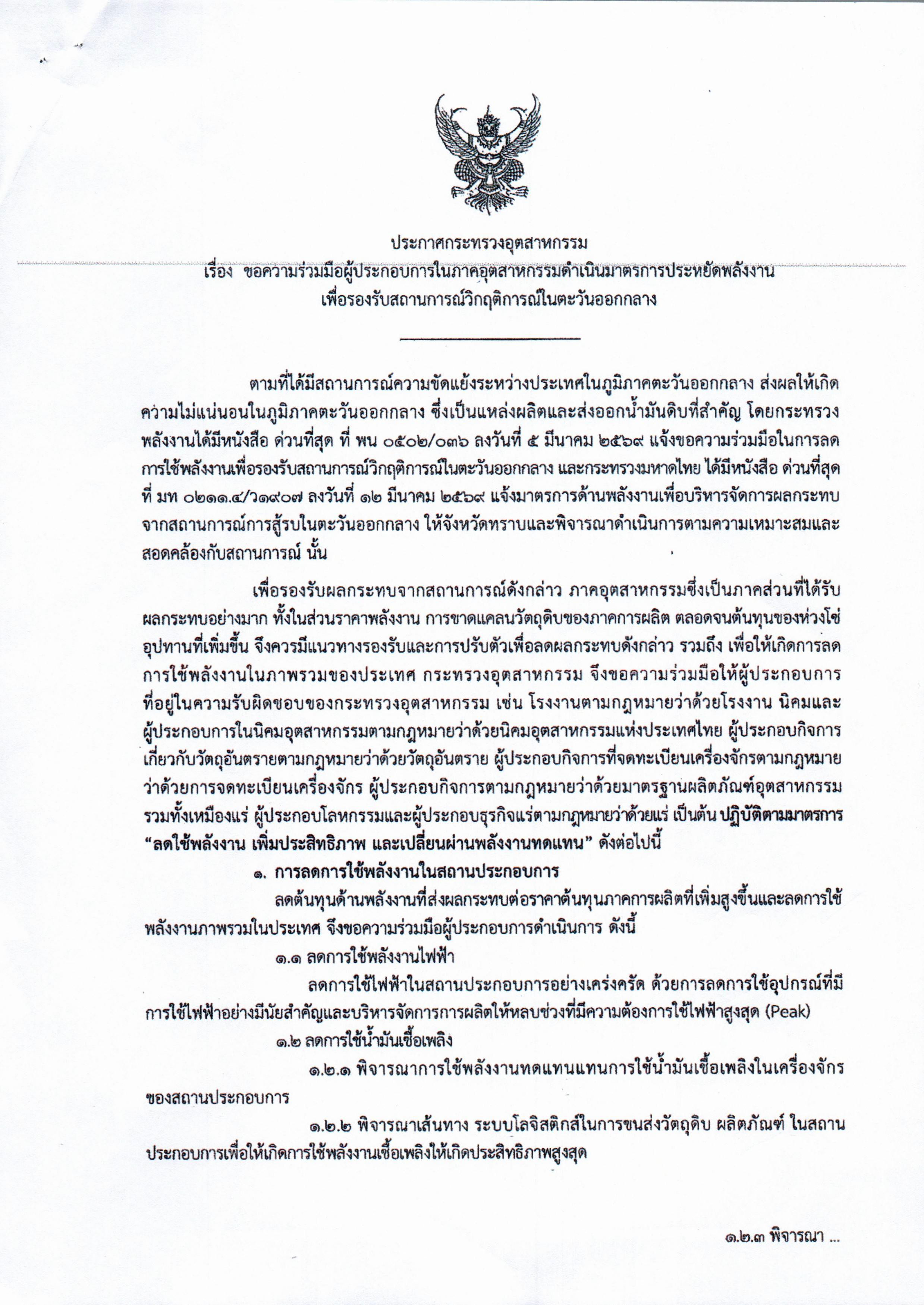 ขอความร่วมมือผู้ประกอบการในภาคอุตสาหกรรมดำเนินมาตรการประหยัดพลังงานเพื่อรองรับสถานการณ์วิกฤติการณ์ในตะวันออกกลาง